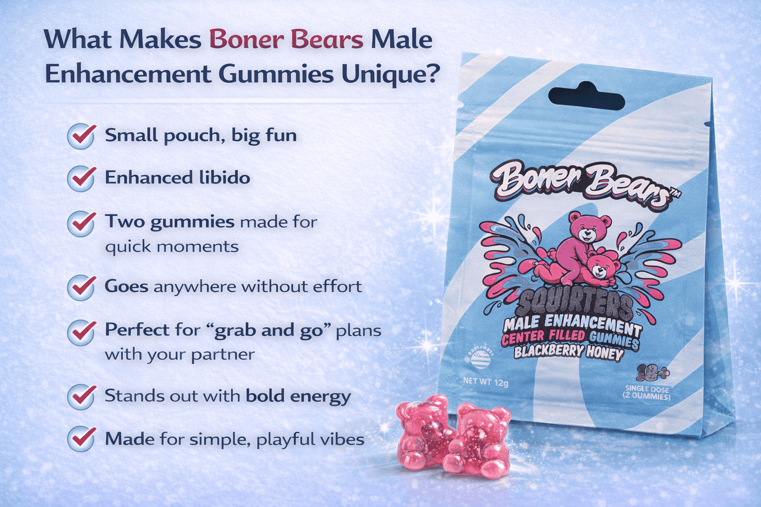 Disclaimer: This content is for informational purposes only and is not intended to diagnose, treat, cure, or prevent any condition. Boner Bears male enhancement gummies are dietary supplements, not prescription medications, and individual experiences may vary. Always read the product label and follow the instructions provided by the manufacturer. If you have any underlying medical conditions, are taking medication, or have concerns about using dietary supplements, consult a qualified healthcare professional before use.