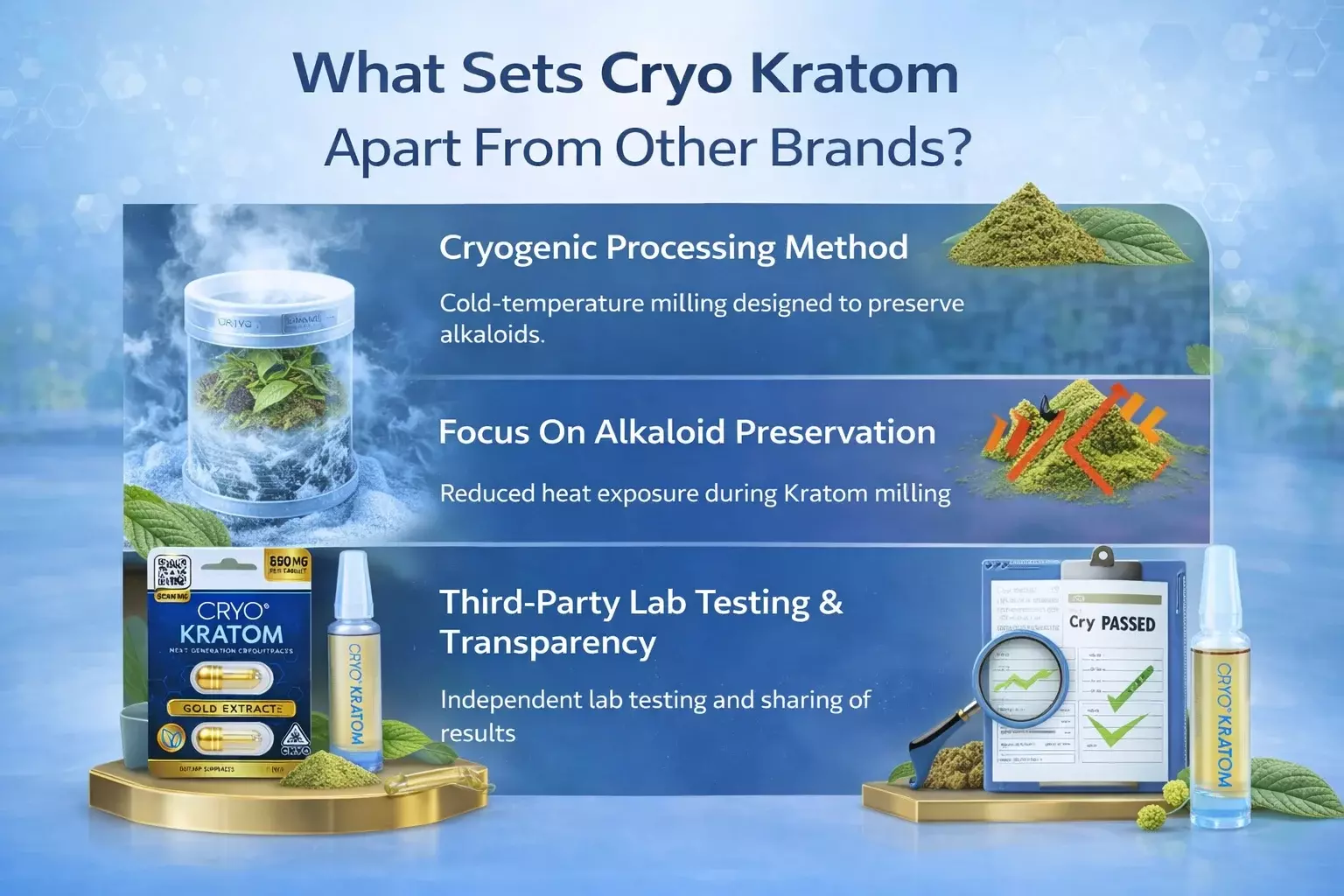 Cryo Kratom tries to stand out by focusing on how its products are processed, tested, and presented. Here’s what makes it unique:
