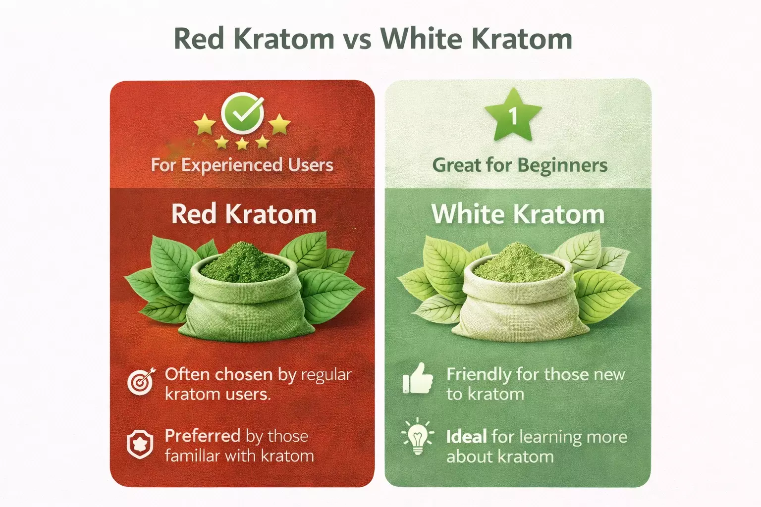 White Kratom is often viewed as more approachable for beginners, while red Kratom is commonly chosen by more experienced users.