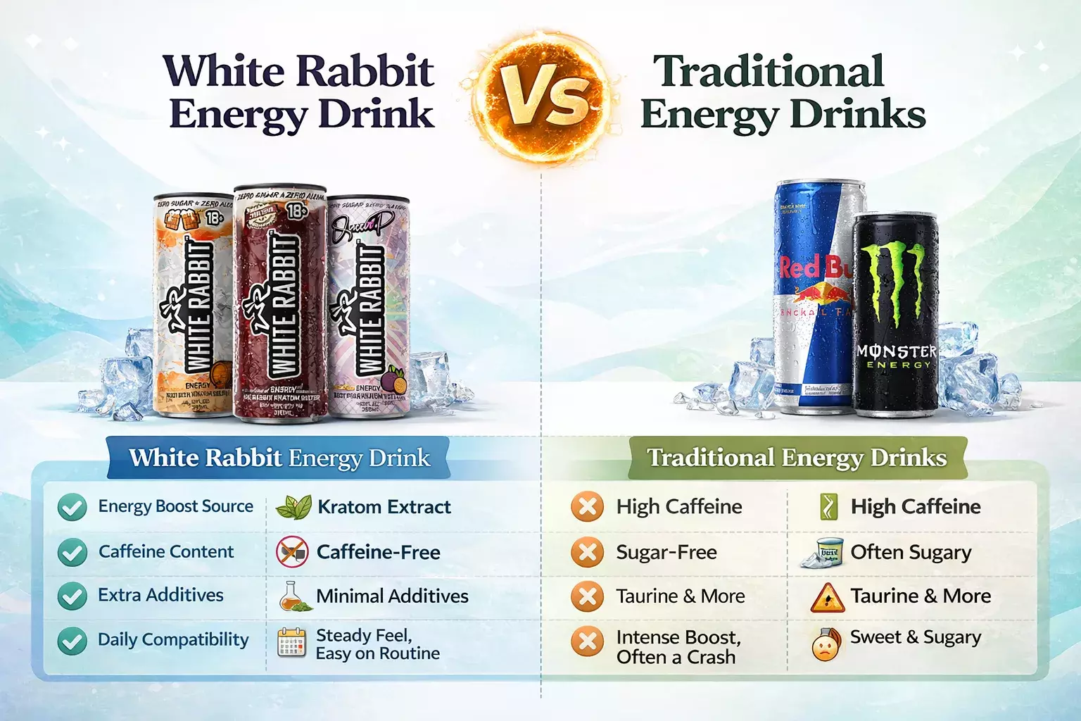 Energy drinks come in many forms, but not all of them are built the same. This quick comparison highlights how White Rabbit Energy Drink differs from traditional energy drinks, making it easier to see at a glance what sets each option apart.